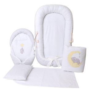 ست 5 تیکه تشک لبه دار و آغوشگیر گلدوزی فیل و ماه سفید