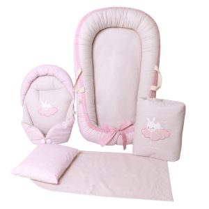 ست 5 تیکه تشک لبه دار و آغوشگیر گلدوزی خرگوش صورتی