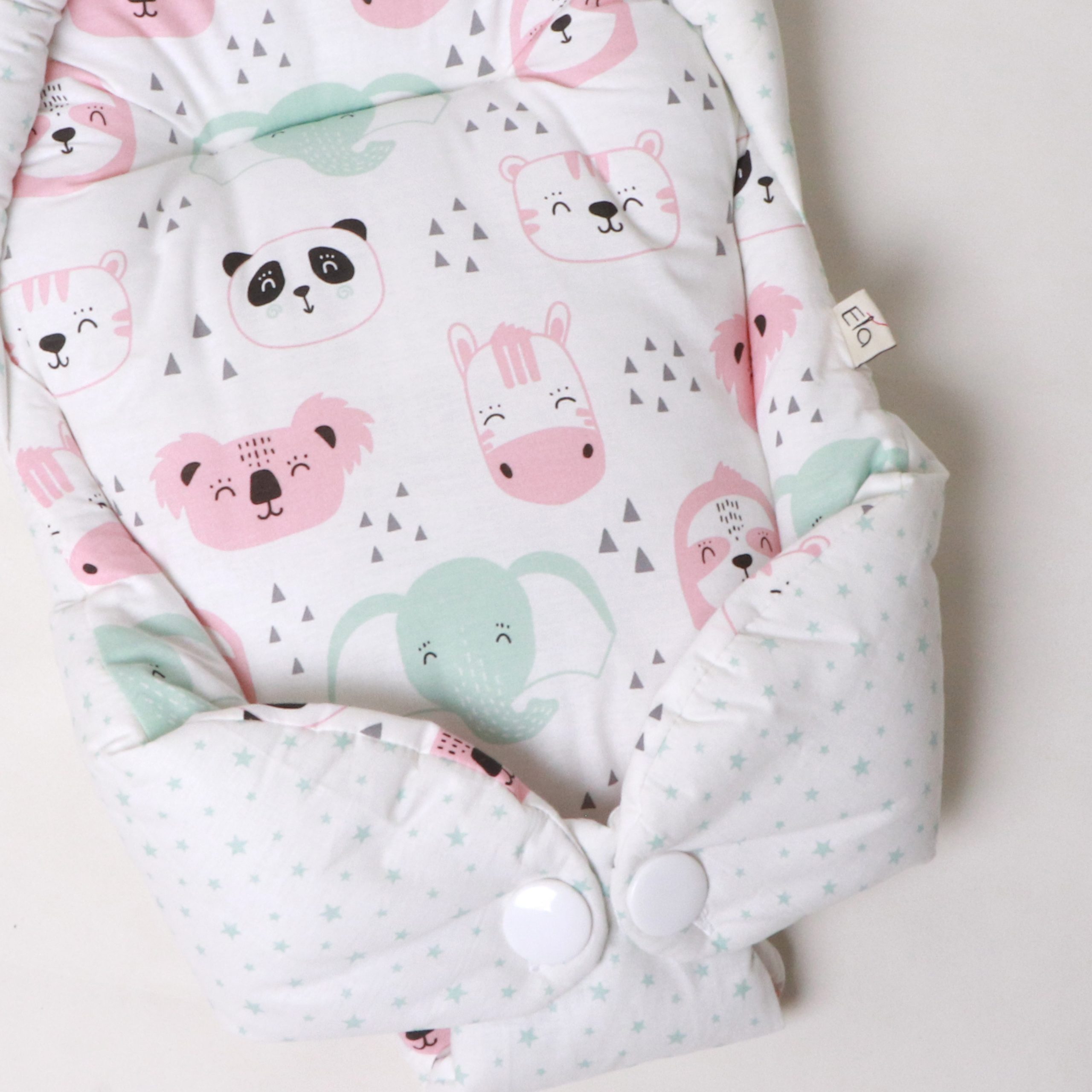 هنگام آغوش گرفتن نوزاد، احتیاط شرط عقل است. بغل کردن‌ نوزاد، در عین‌حال که بسیار شیرین است، سختی‌ها و دستورالعمل‌های ویژه‌ای دارد. آغوش‌گیر اِلا با طراحی ارگونومیک و پارچۀ کاملاً نخ‌پنبه، سه اصل مهم را هم‌زمان فراهم می‌کند: سلامت جسم، سلامت پوست، راحتی نوزاد. راحتی نوزاد به این دلیل است که فرم آغوش‌گیر، بدن نوزاد را در وضعیت طبیعی و جمع‌شده نگه می‌دارد و حس رحم مادر را تداعی می‌کند. به‌هیچ‌وجه پاهای نوزاد را از هم باز نکنید. این حالت پاهای جمع‌شده کاملاً طبیعی است و برای این است که نوزاد هنوز خودش را در شکم مادرش تصور می‌کند. سلامت جسم به این دلیل است که سر و‌ گردن نوزاد در یک‌ حالت نرمال و طبیعی قرار می‌گیرد و فشاری رو ستون مهره‌اش نمی‌آید. سلامت پوست به این دلیل است که پارچه‌ها ۱۰۰٪ نخ‌پنبۀ خالص هستند و هیچ‌گونه الیاف مصنوعی یا مواد شیمیایی در آن‌ها به‌کار نرفته است.