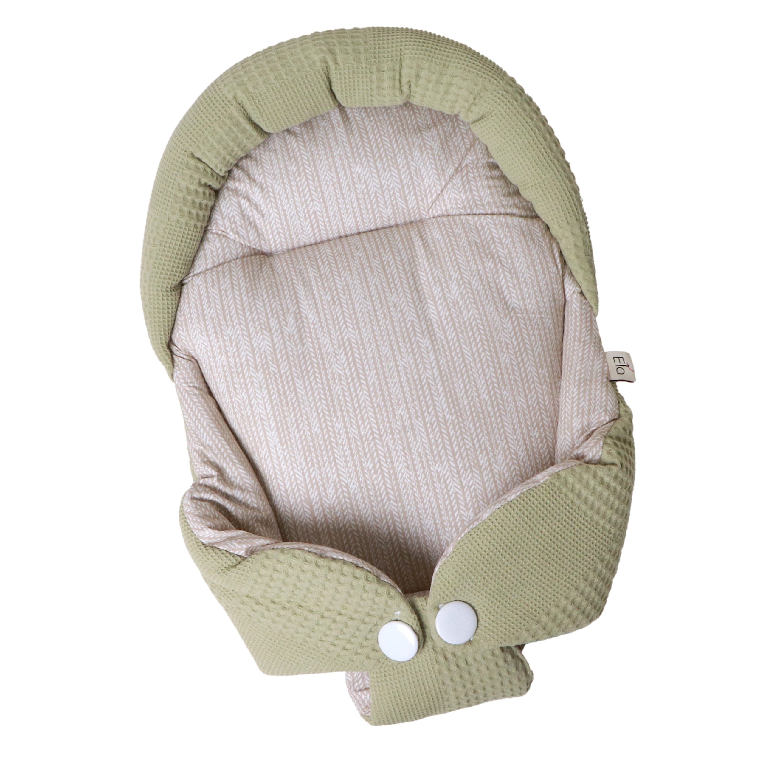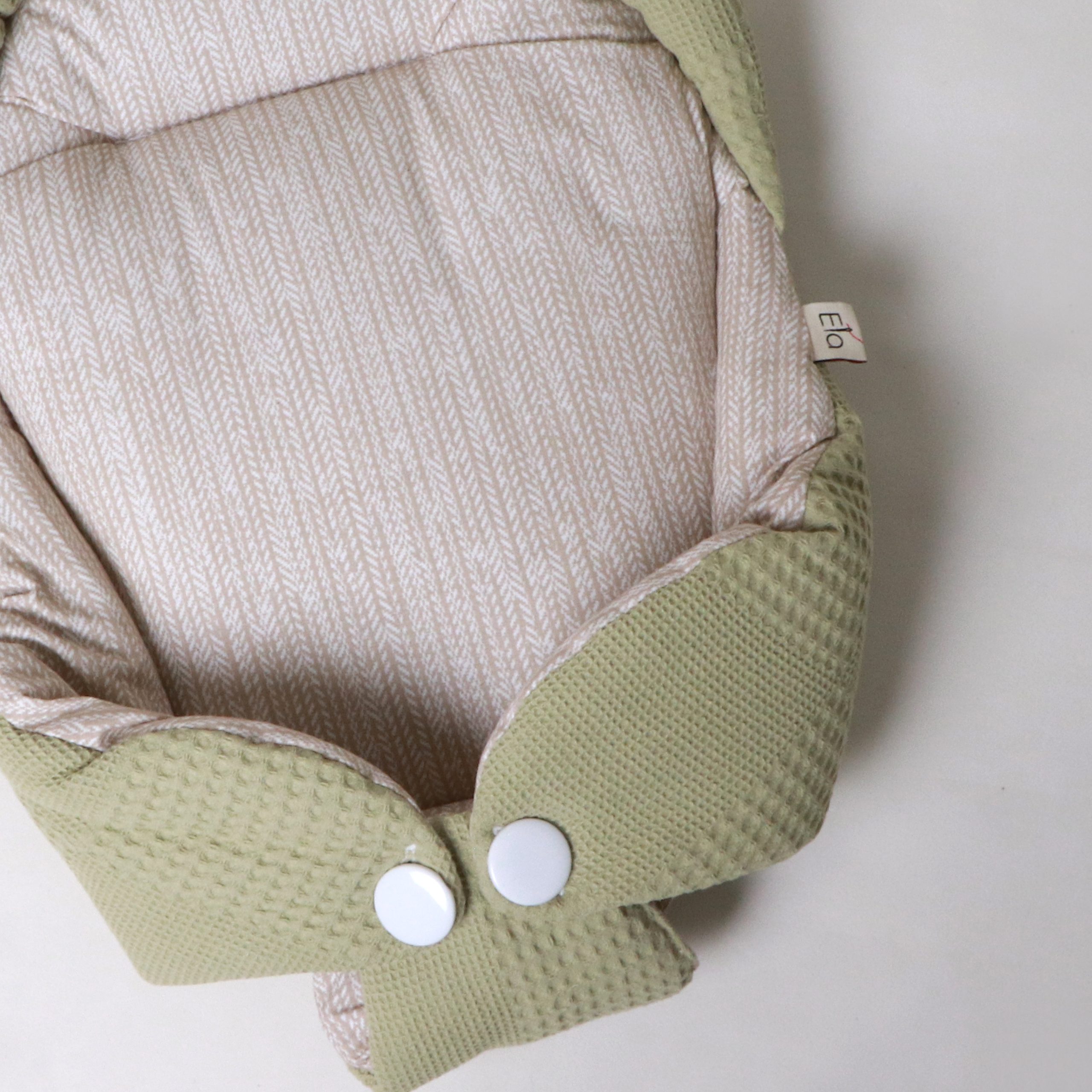 هنگام آغوش گرفتن نوزاد، احتیاط شرط عقل است. بغل کردن‌ نوزاد، در عین‌حال که بسیار شیرین است، سختی‌ها و دستورالعمل‌های ویژه‌ای دارد. آغوش‌گیر اِلا با طراحی ارگونومیک و پارچۀ کاملاً نخ‌پنبه، سه اصل مهم را هم‌زمان فراهم می‌کند: سلامت جسم، سلامت پوست، راحتی نوزاد. راحتی نوزاد به این دلیل است که فرم آغوش‌گیر، بدن نوزاد را در وضعیت طبیعی و جمع‌شده نگه می‌دارد و حس رحم مادر را تداعی می‌کند. به‌هیچ‌وجه پاهای نوزاد را از هم باز نکنید. این حالت پاهای جمع‌شده کاملاً طبیعی است و برای این است که نوزاد هنوز خودش را در شکم مادرش تصور می‌کند. سلامت جسم به این دلیل است که سر و‌ گردن نوزاد در یک‌ حالت نرمال و طبیعی قرار می‌گیرد و فشاری رو ستون مهره‌اش نمی‌آید. سلامت پوست به این دلیل است که پارچه‌ها ۱۰۰٪ نخ‌پنبۀ خالص هستند و هیچ‌گونه الیاف مصنوعی یا مواد شیمیایی در آن‌ها به‌کار نرفته است.