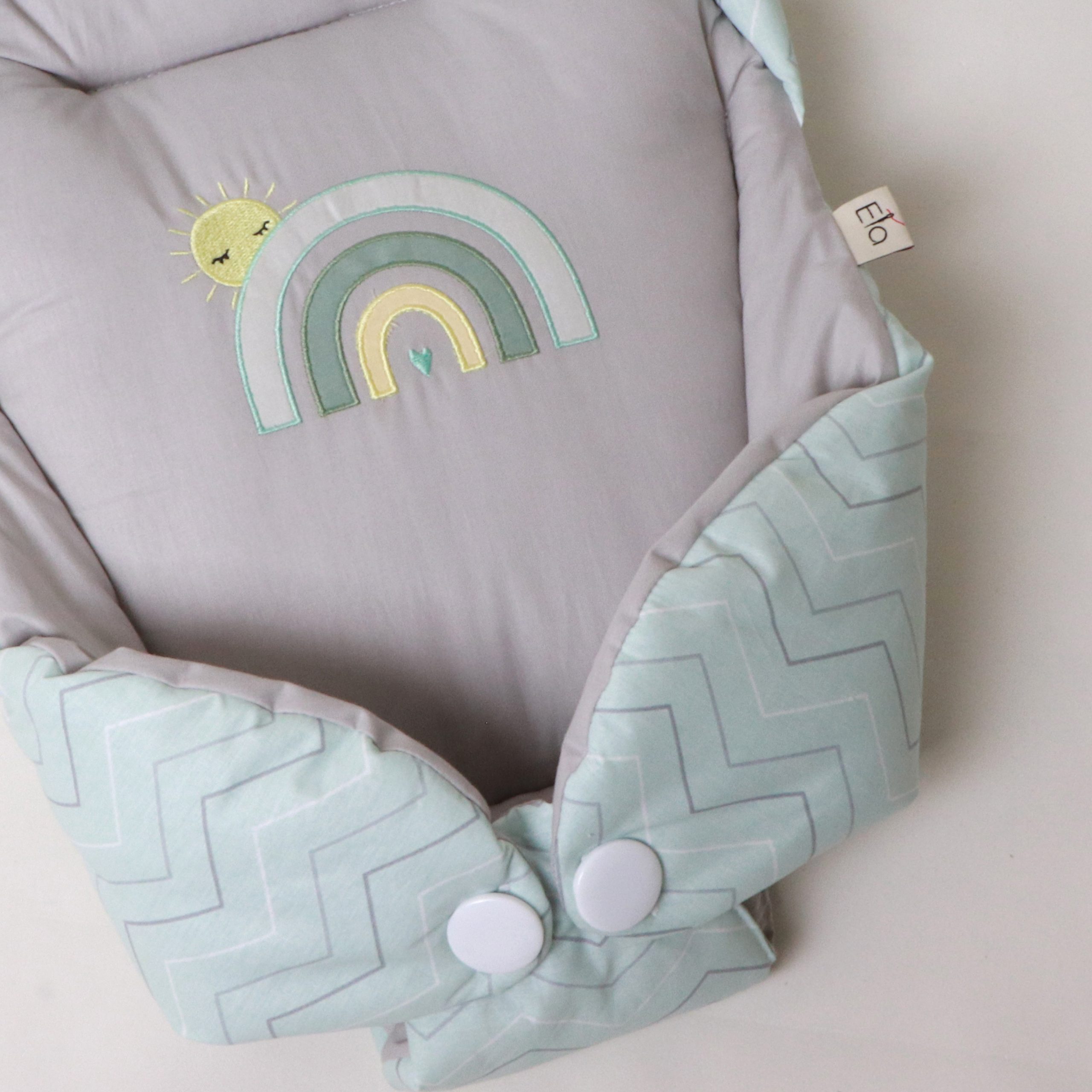 هنگام آغوش گرفتن نوزاد، احتیاط شرط عقل است. بغل کردن‌ نوزاد، در عین‌حال که بسیار شیرین است، سختی‌ها و دستورالعمل‌های ویژه‌ای دارد. آغوش‌گیر اِلا با طراحی ارگونومیک و پارچۀ کاملاً نخ‌پنبه، سه اصل مهم را هم‌زمان فراهم می‌کند: سلامت جسم، سلامت پوست، راحتی نوزاد. راحتی نوزاد به این دلیل است که فرم آغوش‌گیر، بدن نوزاد را در وضعیت طبیعی و جمع‌شده نگه می‌دارد و حس رحم مادر را تداعی می‌کند. به‌هیچ‌وجه پاهای نوزاد را از هم باز نکنید. این حالت پاهای جمع‌شده کاملاً طبیعی است و برای این است که نوزاد هنوز خودش را در شکم مادرش تصور می‌کند. سلامت جسم به این دلیل است که سر و‌ گردن نوزاد در یک‌ حالت نرمال و طبیعی قرار می‌گیرد و فشاری رو ستون مهره‌اش نمی‌آید. سلامت پوست به این دلیل است که پارچه‌ها ۱۰۰٪ نخ‌پنبۀ خالص هستند و هیچ‌گونه الیاف مصنوعی یا مواد شیمیایی در آن‌ها به‌کار نرفته است.