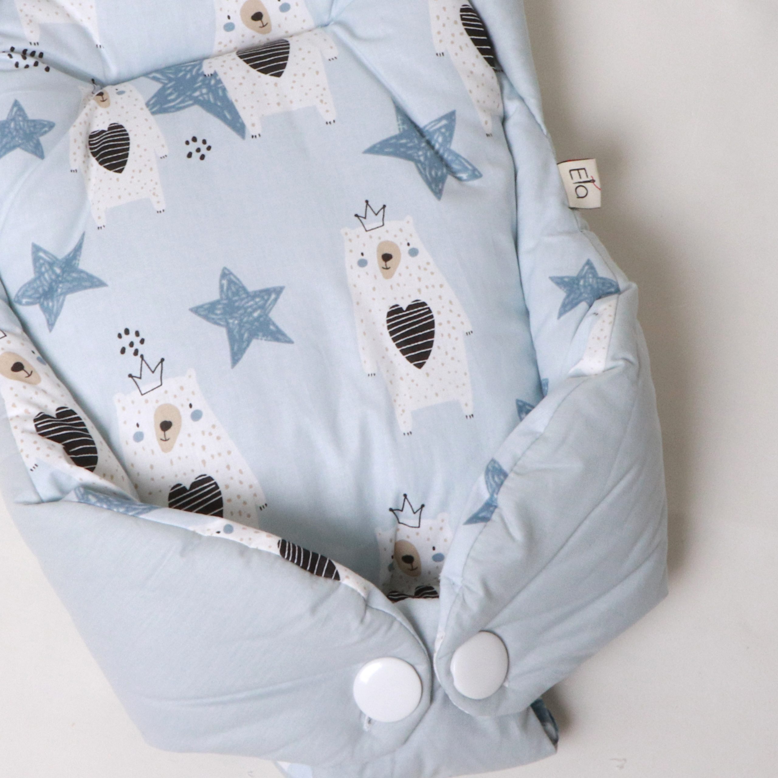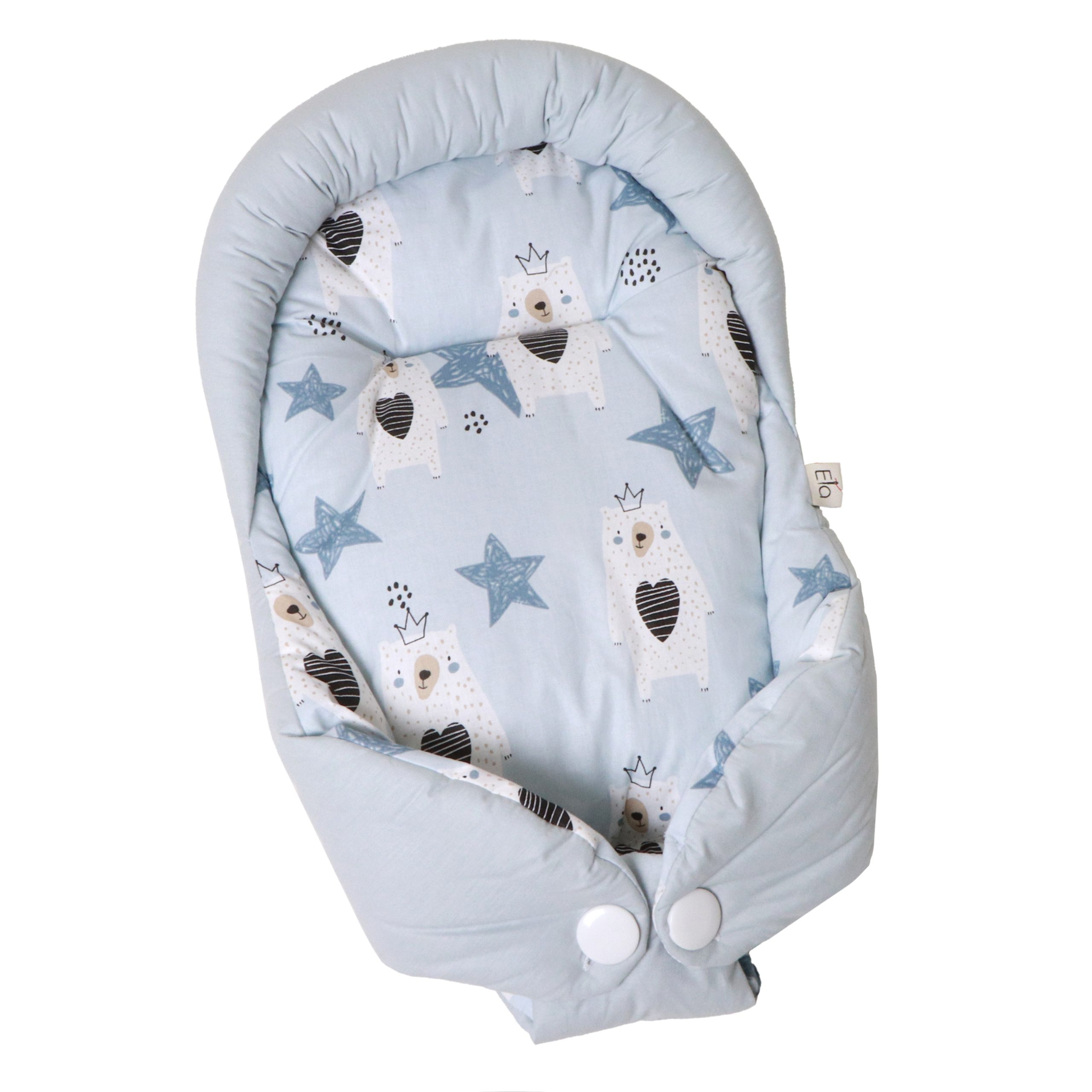 هنگام آغوش گرفتن نوزاد، احتیاط شرط عقل است. بغل کردن‌ نوزاد، در عین‌حال که بسیار شیرین است، سختی‌ها و دستورالعمل‌های ویژه‌ای دارد. آغوش‌گیر اِلا با طراحی ارگونومیک و پارچۀ کاملاً نخ‌پنبه، سه اصل مهم را هم‌زمان فراهم می‌کند: سلامت جسم، سلامت پوست، راحتی نوزاد. راحتی نوزاد به این دلیل است که فرم آغوش‌گیر، بدن نوزاد را در وضعیت طبیعی و جمع‌شده نگه می‌دارد و حس رحم مادر را تداعی می‌کند. به‌هیچ‌وجه پاهای نوزاد را از هم باز نکنید. این حالت پاهای جمع‌شده کاملاً طبیعی است و برای این است که نوزاد هنوز خودش را در شکم مادرش تصور می‌کند. سلامت جسم به این دلیل است که سر و‌ گردن نوزاد در یک‌ حالت نرمال و طبیعی قرار می‌گیرد و فشاری رو ستون مهره‌اش نمی‌آید. سلامت پوست به این دلیل است که پارچه‌ها ۱۰۰٪ نخ‌پنبۀ خالص هستند و هیچ‌گونه الیاف مصنوعی یا مواد شیمیایی در آن‌ها به‌کار نرفته است.