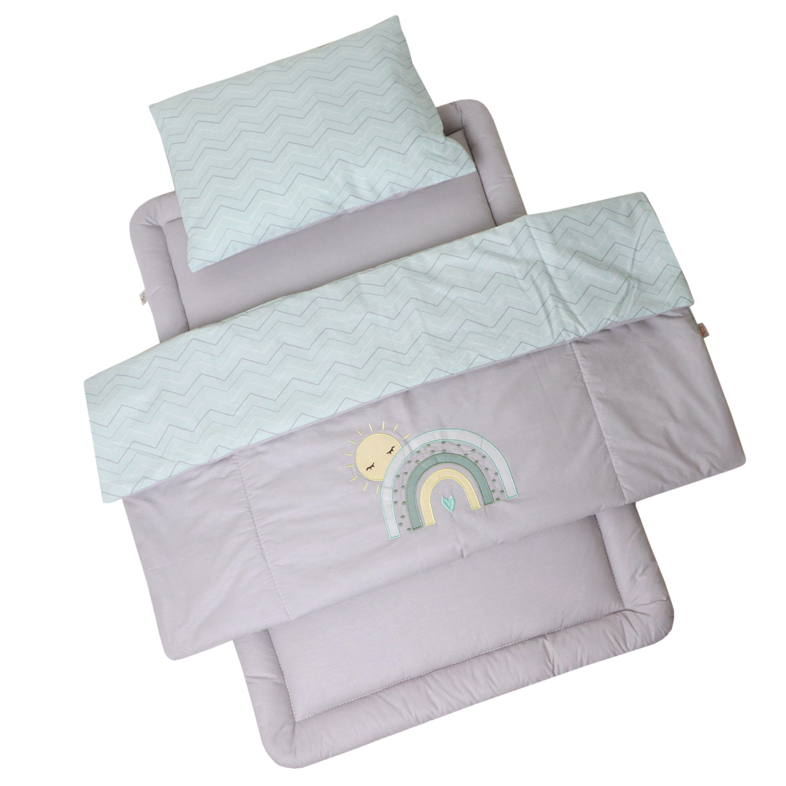 دمدستی سایز ۲ مناسب تخت کنار مادر، گهواره و تخت پارک است و لحاف بزرگتر و گرمتری دارد.