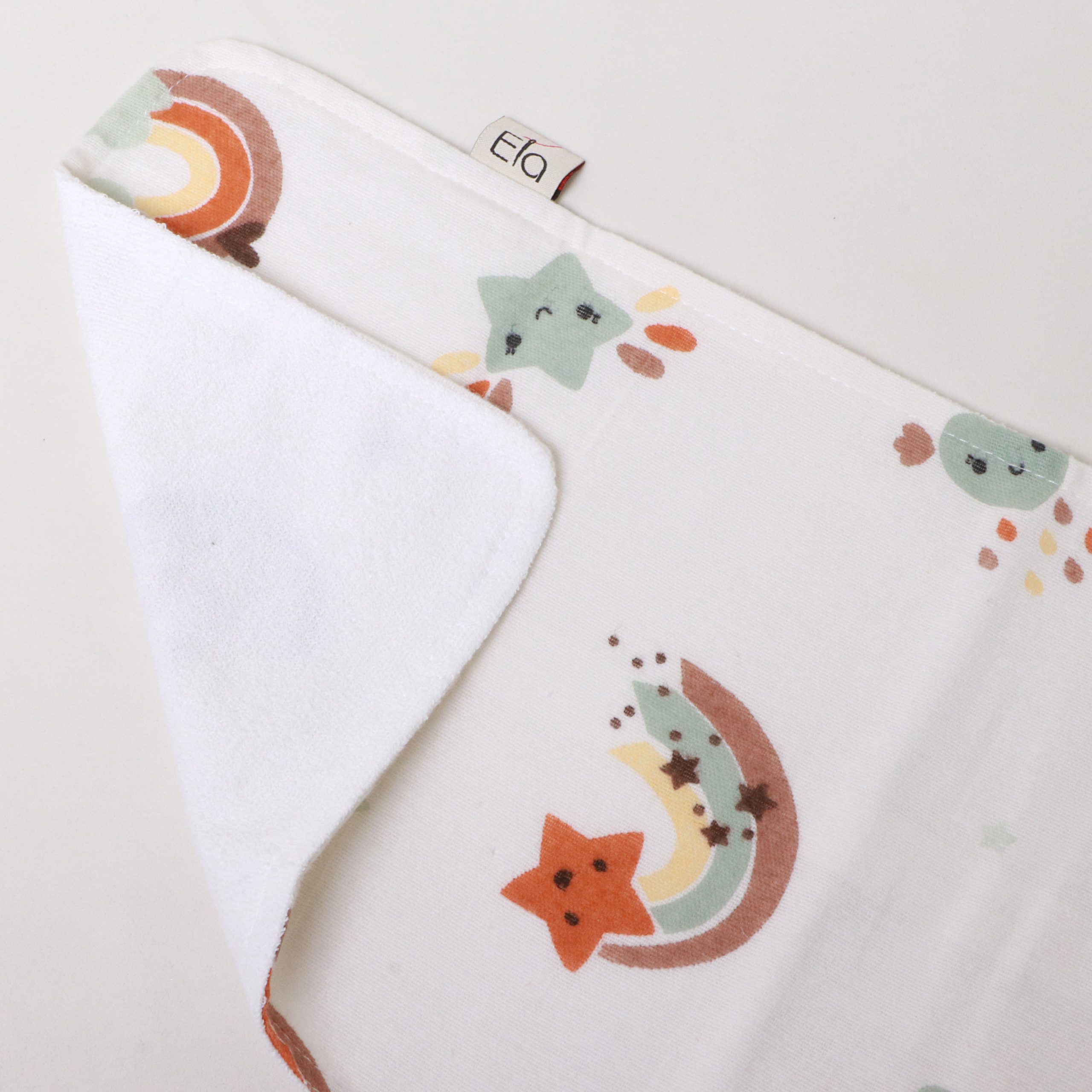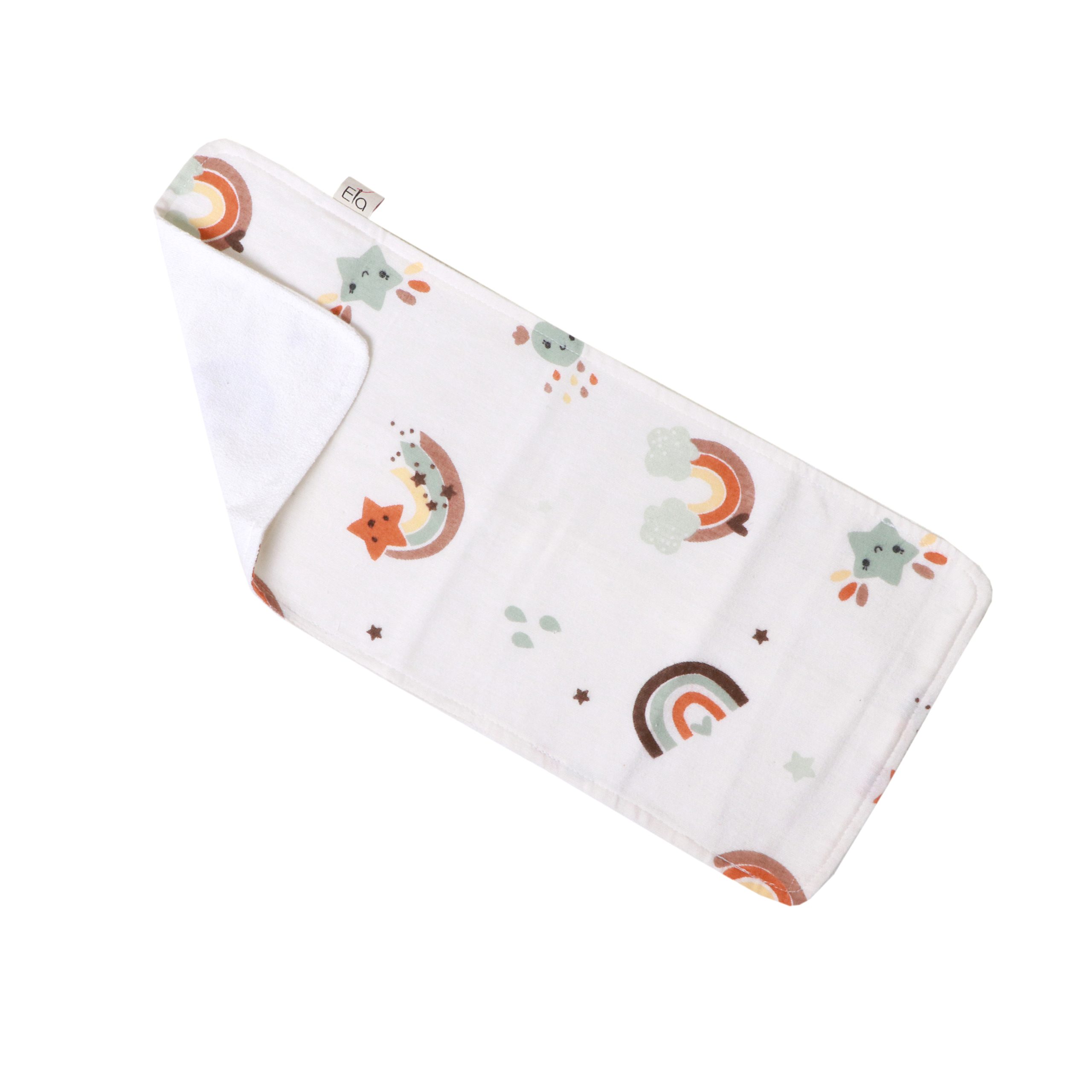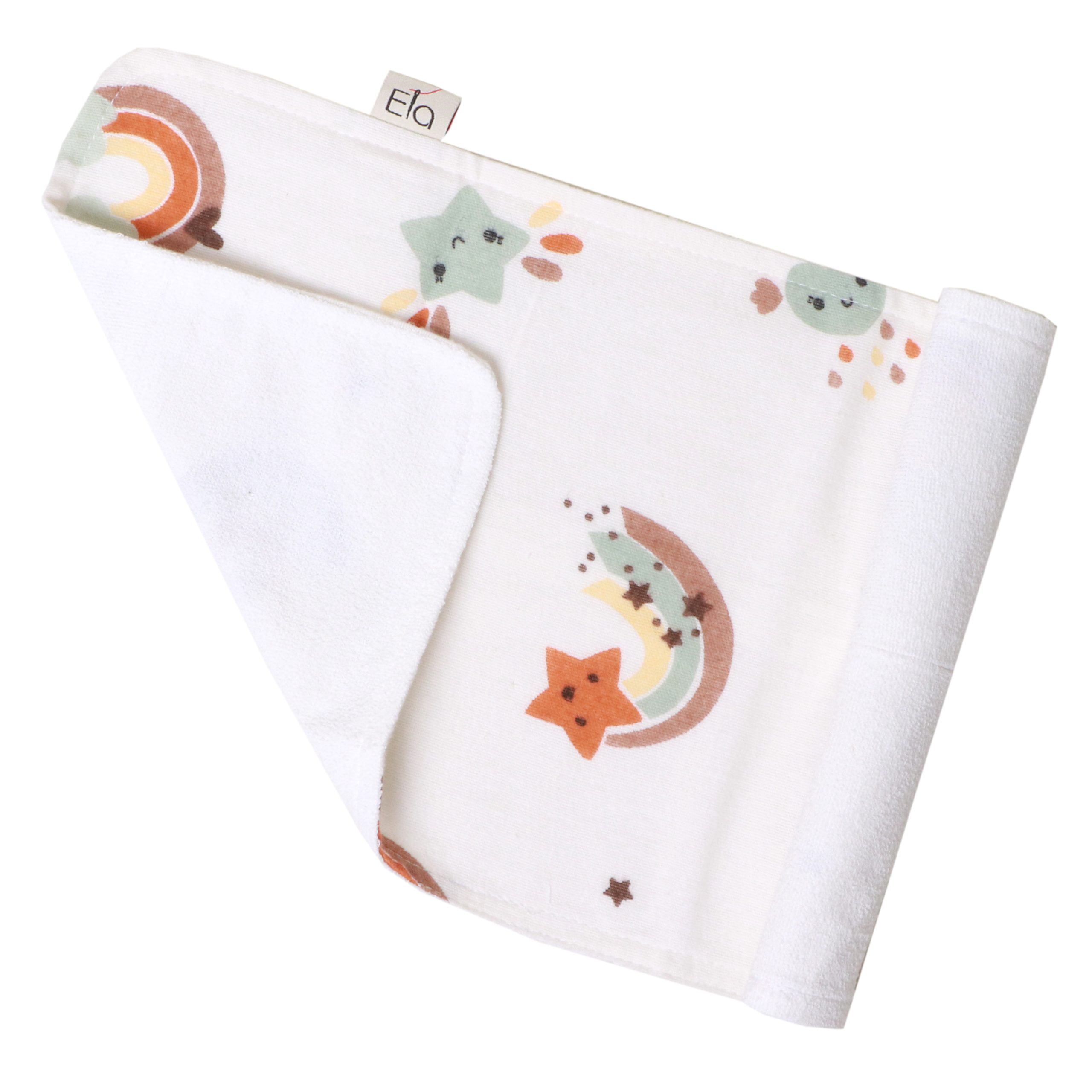 این دستمال با پارچه صددرصد نخ پنبه‌ای، لطافت و جذب بالایی دارد و به‌راحتی روی شانه قرار می‌گیرد تا هنگام آروغ‌گیری نوزاد از لباس محافظت کند و بافتی ضد حساسیت برای پوست ظریف کودک فراهم سازد.